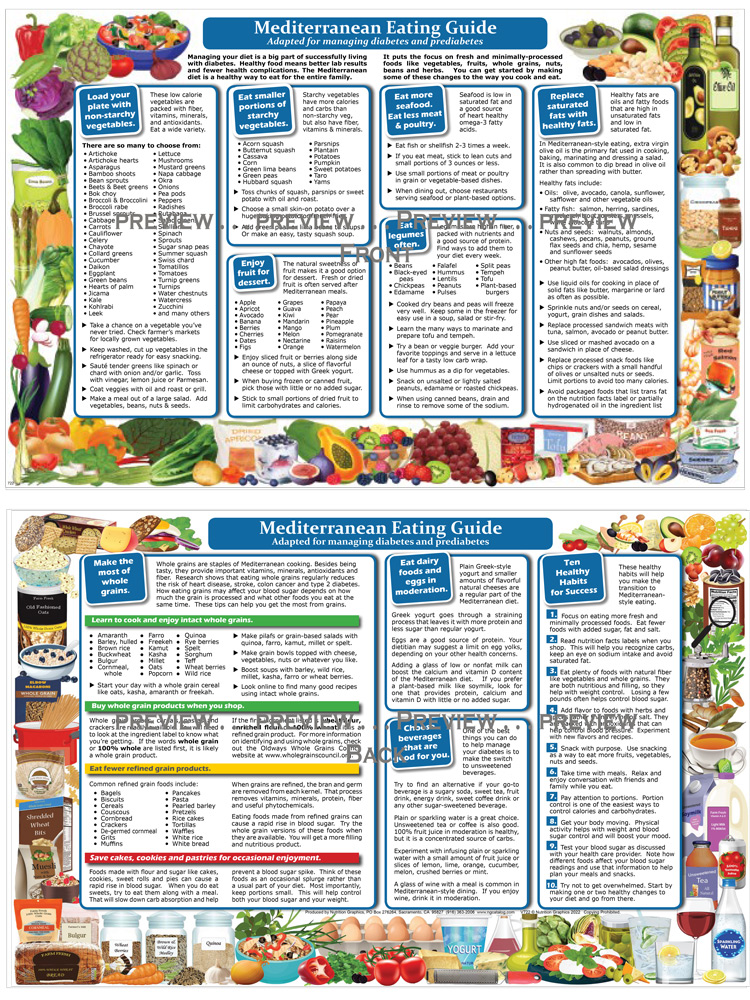 The Mediterranean Diet is recognized as a healthy meal pattern for diabetics. This handout gives the basics of the Mediterranean Diet with more emphasis placed on carbohydrate awareness. It lists the starchy and non- starchy vegetables separately and offers tips on choosing foods and beverages that help minimize blood sugar spikes. This colorful chart is easy to read and provides an excellent introduction to this healthy way to eat. 11” x 17” folded in half. Item No. NX03