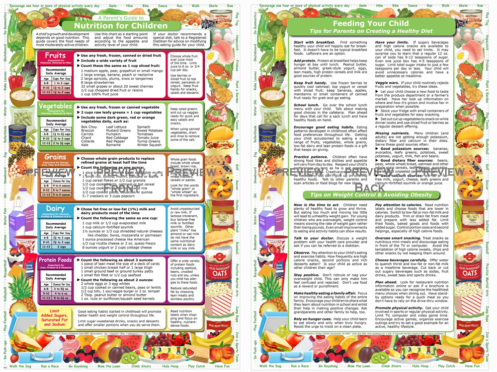 This colorful handout lists the foods needed for ages 6-8, 9-10 and 11-13. It’s based on the U.S. Dietary Guidelines and compatible with My Plate materials. This chart gives a good overview of nutritional needs. On the back are 20 helpful food and nutrition tips for parents. 11″ x 17″ folded in half.  Item # EC29