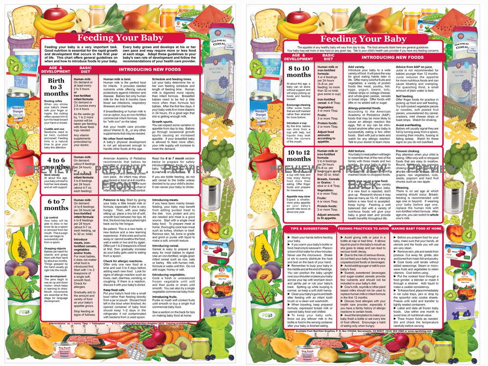 This handout reflects the latest recommendations from the American Academy of Pediatrics on introducing new foods and holding off on giving juice until after age one. This colorful chart gives guidance for feeding babies from birth to age one. It provides both basic diet needs and tips on when and how to introduce new foods. Practical “how-to” and “how much” suggestions make this handout very useful. This is one of our most popular guides. It is specific, but not rigid. It emphasizes paying attention to an individual baby’s appetite. A big help to new parents. 11” x 17” folded in half, printed both sides. Item #EB27 (Also available in Spanish – Item #SB37)
