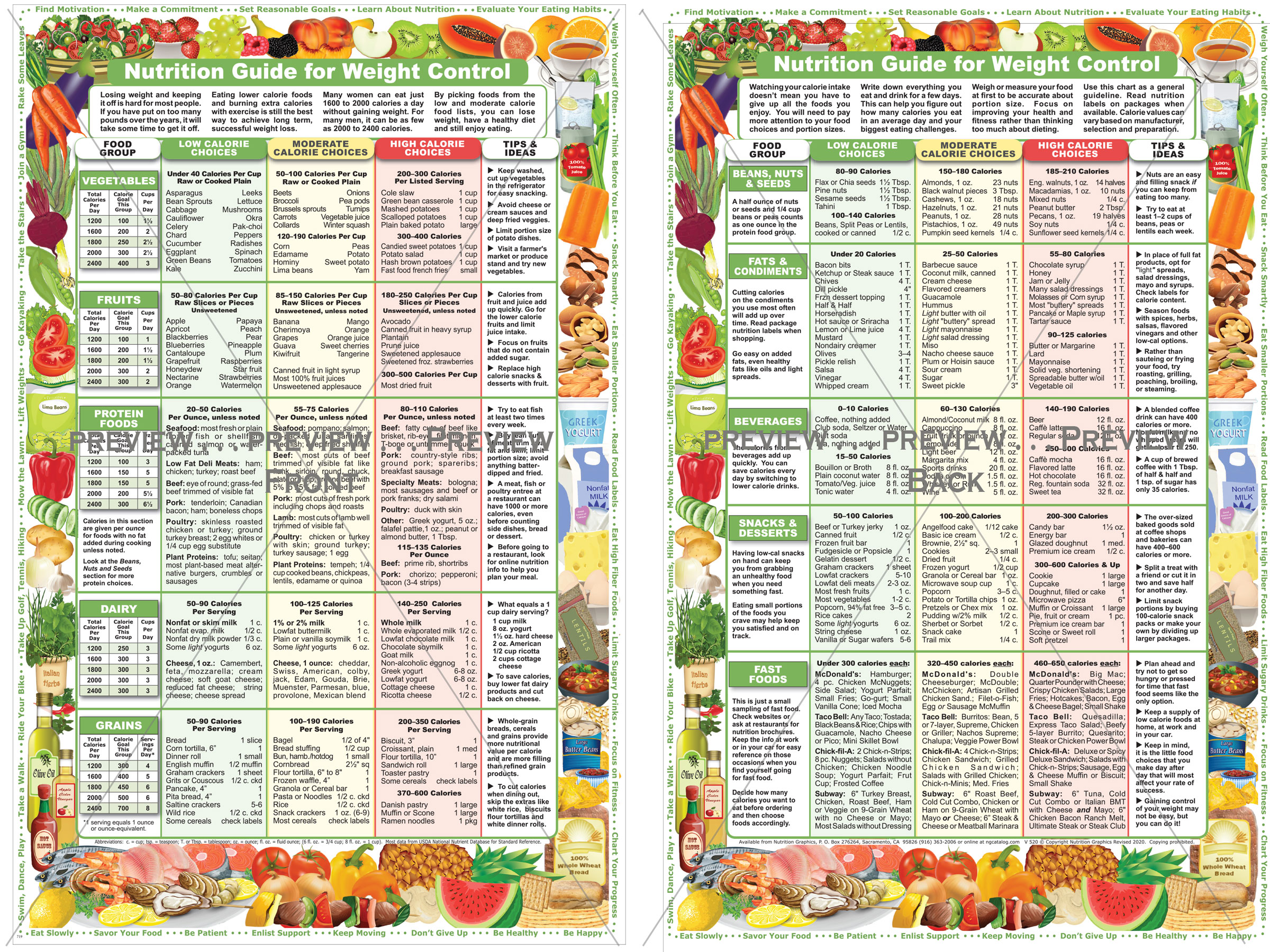 This handout uses red, yellow and green colored columns to show how to eat a nutritionally sound diet while making lower calorie choices. It offers guidance on how many servings are needed from each food group at 1200, 1600, 2000 and 2400 calorie levels. It lists specific foods within each group by low, moderate and high calorie choices and offers tips and suggestions for cutting calories. In addition to the main food groups, listings are given for fats & condiments, beverages, snacks & desserts and fast foods. This is not new information, but a neat, colorful way to show patients exactly how to make wise food choices. 11″ x 17″ printed both sides and folded in half.    Item # NW01