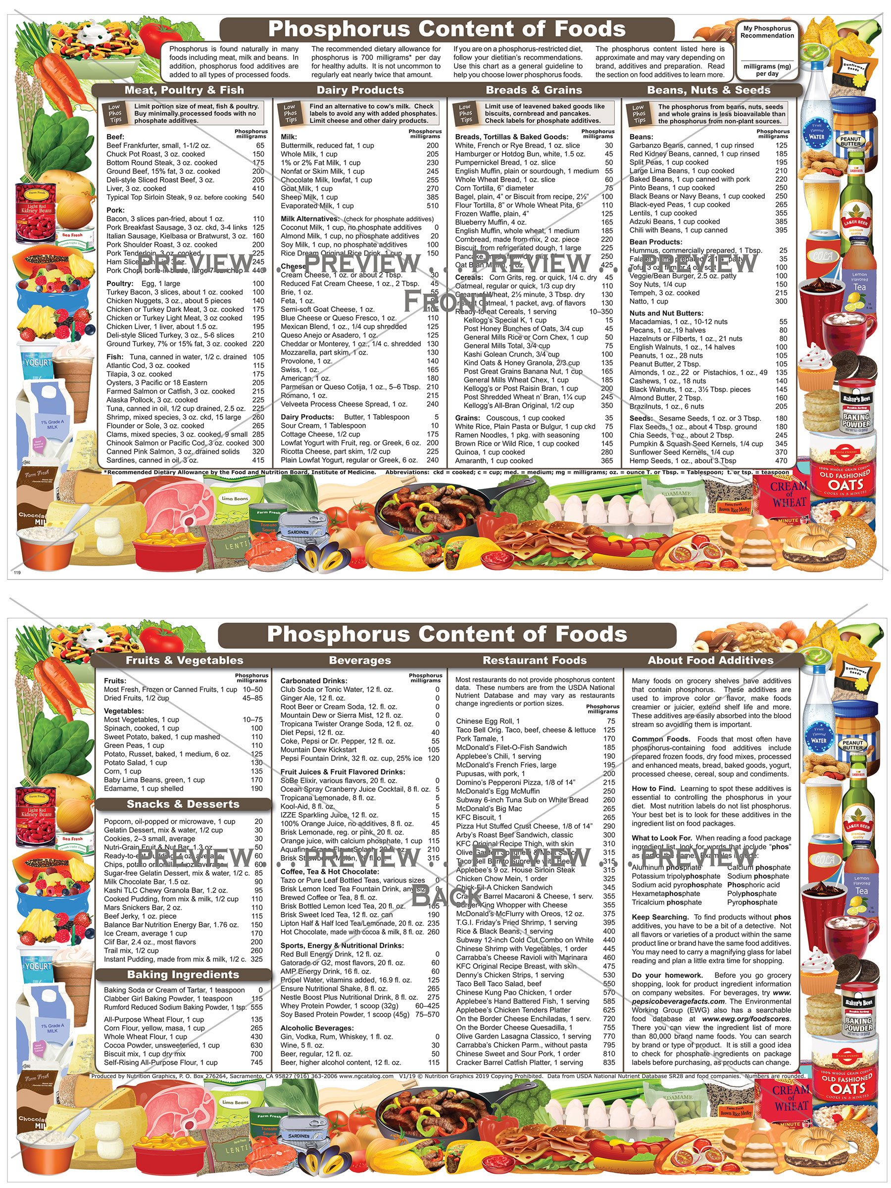 The Phosphorus Content of Foods shows the milligrams of phosphorus in more than 250 common foods including some restaurant foods. It includes tips for choosing lower phosphorus foods and information on how to spot phosphorus-containing food additives on product labels. This colorful and easy-to-read chart makes a handy take-home reference for renal patients. It will be used again and again. Data from USDA ARS FoodData Central and food companies. 11″ x 17″ folded in half. Item # CH90